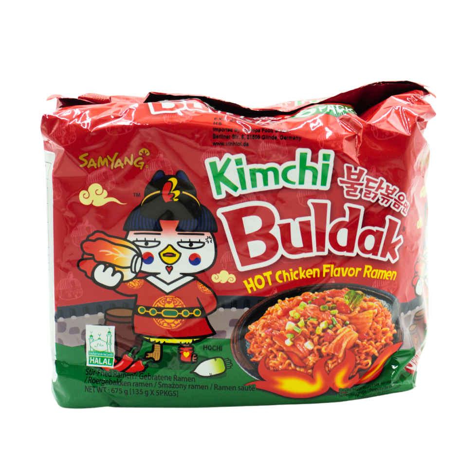 Flydende sovs: Vand, hvidt sukker, kimchi-pulver, kunstig kyllingesmag, majssirup, sojaolie, rød peberpasta, chilipulver, sojasovs, løg, kunstigt kyllingesmagspulver, smagsforstærker [mononatriumglutamat (E621)], rød peberpulver, hvidløg, modificeret kartoffelstivelse, paprikaekstrakt, bleget chili-ekstrakt, farve (karamelpulver (E150c)), sort peberpulver, surhedsregulator [dl-æblesyre (E296)]. Tørrede kimchi-flager.