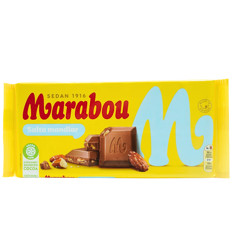 Sukker, kakaosmør, kakaomasse, mandel (7,5%), vallepulver (mælk), skummetmælkspulver (mælk), smørfedt (mælk), valleprodukt (mælk), emulgeringsmiddel (sojalecithiner), glukosesirup, salt, aroma.