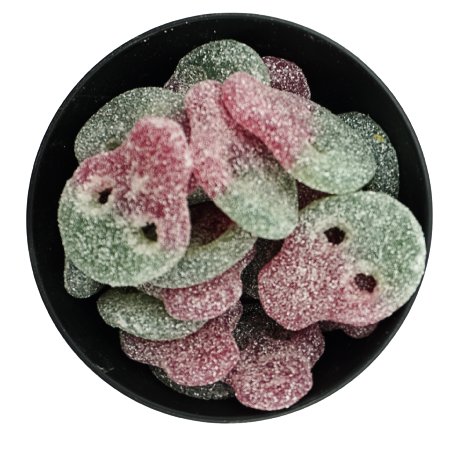 Glukossirup, sukker, modificeret stivelse (glutenfrit VETE, majs, potatis), surhedsregulerende: E330, E296, E350, E270, aromaer, färgämne: E141, svartmorotskoncentrat